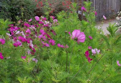 The soil of this long, curbside strip is a dense adobe clay, a product of decayed volcanic rock (primarily tuff). In the late summer, it dries into many small cracks, which undoubtedly catch the tiny Cosmos seeds as they blow along the ground. Where the Cosmos now flourishes, is the only stretch of soil (8' out of about 120' of curbside soil) which we have never cultivated, planted, or amended with any planting mixtures or fertilizers.