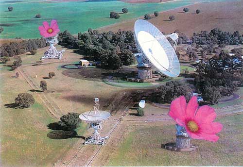 The “cup” of the Cosmos in full bloom is exactly the shape of a dish antenna, and is even “aimed,” at the sky at much the same angle as these wave receivers. The fully-open Cosmos blossom often turns this “dish antenna” somewhat towards the sun. When the wind blows, the blossoms turn their undersides to the direction of the wind so that the inner, fertile disc is sheltered behind a round “parasol” of ray florets.
