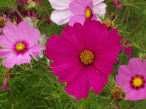 A number of magical, neopagan-oriented websites list Cosmos as one of a couple dozen flowers (including Shasta daisies, thyme, sage, lavender & rosemary) that will attract Faeries to a garden. Various writers assert that Faeries will be most at home in a “wild” (uncultivated) corner of the garden (which is also the environment where Cosmos is most at home).