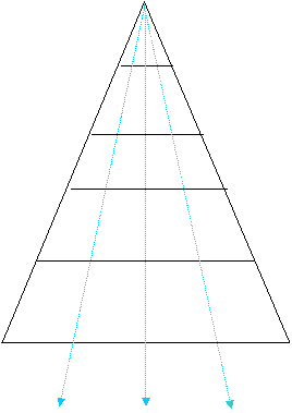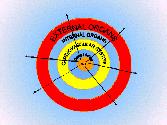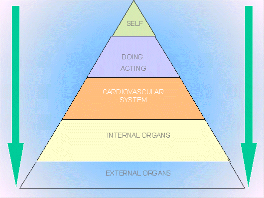 If we try to visualize this concept by means of a cone, representing the individual’s hierarchy as a whole, we see that the highest portion is the Self, of the deepest, either conscious and unconscious being, including mind and thinking. The second layer of the cone is the ability of doing, that is, to put into practice what lies in the ideas; the realization of the will. The third layer constitutes the cardiovascular system (including blood, lymph and intra- and extra-cellular fluids), the fluid portion of the body. Then we have the internal organs and finally the lowest layer, the external organs.