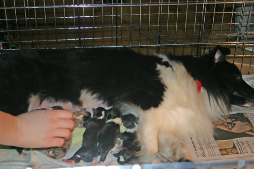 Maize is a 2 ½ year old bi-black Shetland Sheepdog. Her father is a top show dog and her mother was also a show dog. She is owned by her breeder, and has lived in a kennel for much of her life. She received human contact and attention daily from the breeder and her family members while living in the kennel. Maize was on a relatively decent quality dry dog food while living with the breeder. After she was with us for a couple of months, I switched her diet over to a balanced home made raw diet. As the breeder does not believe in over-vaccinating her dogs, Maize received the required rabies vaccine and the minimum number of other necessary vaccines. She was also on a year-round heartworm prevention. Aside from needing a bath, she was in good condition and has a nice healthy coat, good skin, and has no known health problems.