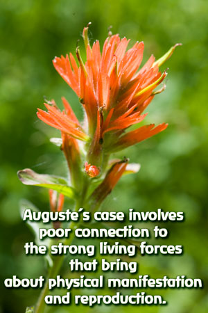 Case Study: Auguste—the Mars MetaFlora Level As an example of work according to the idea of MetaFlora levels, I would like to mention the case of Auguste, a French man living in Barcelona. Auguste comes to see me because he has a reproductive problem. He has been told by his doctor that he can’t have children; even though his sperm is seemingly well formed and in proper shape and size, it does not move at all and can’t therefore fertilize his wife’s ovules. The couple has already been through artificial fertilization processes but with no luck, and he wants to try flower essences. Born in 1962, Auguste, who actually bears three Christian names recalling powerful kings and emperors of ancient times, seems to be a peaceful man who has led the normal life of a French man of his time. He has neither old traumas that he can recall, nor great family upheavals or other troubles in his past or present life that he can tell me about. However, there is something very passive within him that makes me think of the Mars MetaFlora level as soon as he starts talking about his problem. It seems that he somehow has a kind of weak relationship with his physical body that manifests in his sperm being so lazy that it does not move and does not, therefore, accomplish its instinctive task with passion and the needed physical strength. So I was sure that it was through the Mars MetaFlora level that I would start working with him. We spoke about strength and movement, and he told me that he is prone to procrastination and slow movements. He works on computer programs and his energy is mostly in the mind and not so much on the lower parts of the body. Whenever he has to deal with material things or realities, procrastination comes up. Auguste’s is not a case of lack of maturity (his sperm is mature but lacks movement), but of poor connection to the strong living forces that bring about physical manifestation and reproduction. Therefore, I thought of a combination of flower essences that could touch upon manifestation in the world, movement and strength– Mars MetaFlora level: