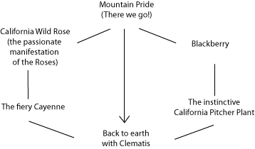 I wanted to soften his intellectual tendencies and his being prone to live in the mind and/or other worlds ( Nasturtium , Clematis ), and yet promote his getting in touch with creative and instinctive-bound procreative forces ( Indian Paintbrush , Trumpet Vine , California Pitcher Plant ) so that he could fully manifest in the world ( Blackberry ).