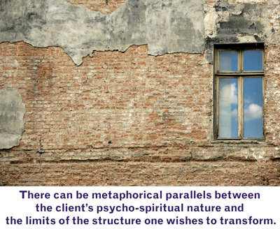 The human energetic field receives complex signals from its physical environment and no environment is more important than home By the time a potential client calls for a design and construction consultation, the building has usually reached some type of critical issue. Many times it is an older structure with serious problems. The client’s Wish List is extensive and demands correction. The metaphorical parallels – between the client’s psycho-spiritual nature and the limits of the structure he/she wishes to transform – became more obvious to me as I journeyed down the road of experience.