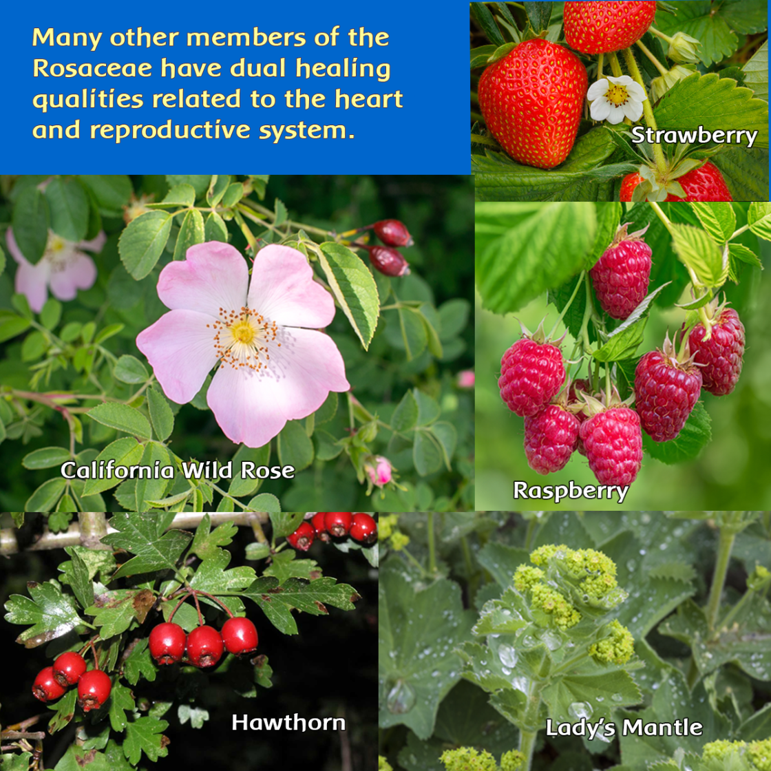 It is also noteworthy that the Downy Avens is a member of the Rosaceae family, with other plants that have a dual connection to the heart and the reproductive system. For example, strawberry and raspberry leaves are well-established uterine tonics, while Rose blossoms along with rose hips and rose essential oil, Hawthorn and Lady’s Mantle are generally restorative for the female reproductive system as well as the heart. Many of the fruits in the Rosaceae family contain nutritional forces that build the blood and thereby nourish the gestational and lactational functions, especially cherry, apple, strawberry and raspberry fruits.